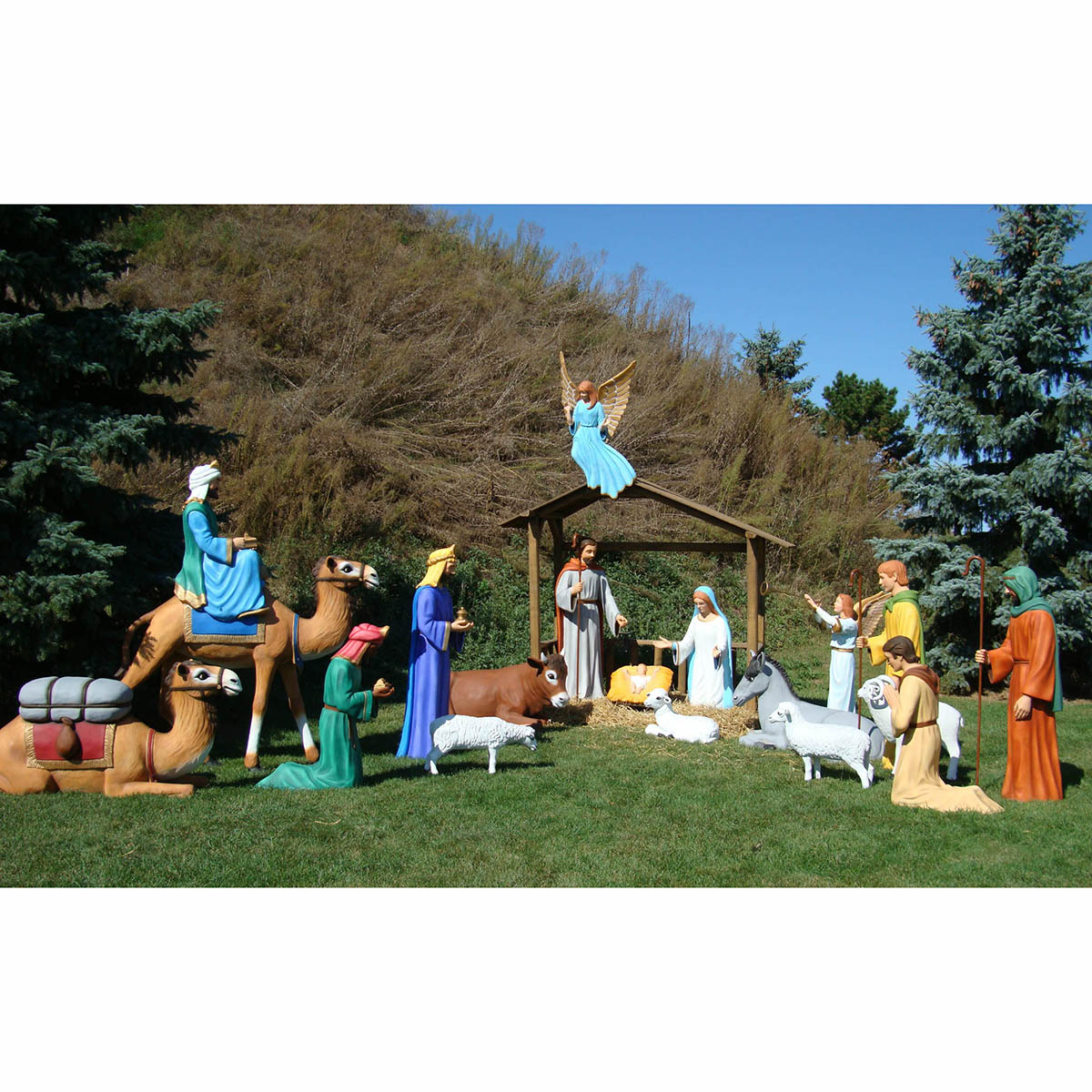 Joseph figure stands with his staff and lantern. Measures 21"x5'5" tall. Bronner's exclusive life size Nativity is expertly cast of rigid fiberglass for indoor or outdoor use. Authentically hand-painted and comes in a natural, iridescent, or white finish and features a reinforced metal brace at the base for securing on display. Shipping weight is 75 lbs.